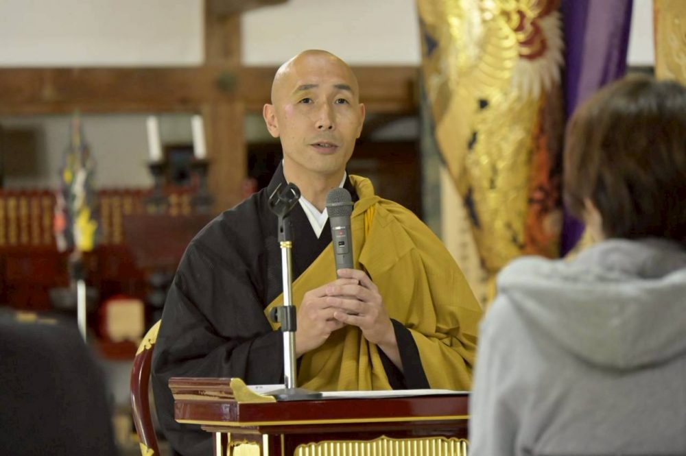 昼食・法要の進退確認を経て、13時より一般参加者の受付、13時半の開式となった。開式挨拶ののちに秋田市下浜珠林寺ご住職の鮎川義寛氏による法話が行われた。ご自身の経験による出来事や想いを含めたお話を展開して頂いた。