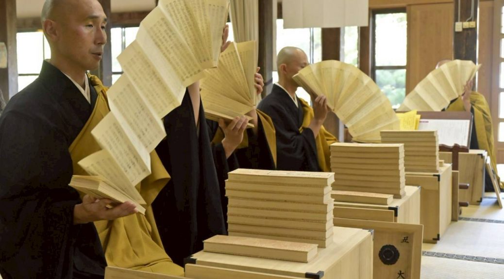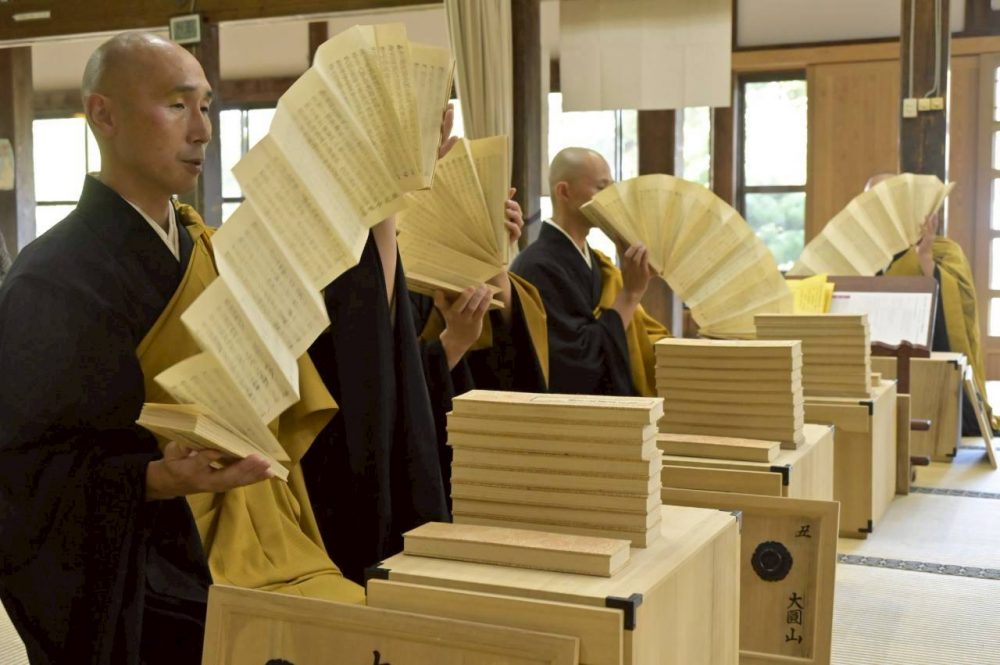 法話終了後、その場にて静座(心穏やかに、静かに座る時間)、引き続き追悼法要が行われた。今回の法要は「転読大般若」。梅花のお唱えを交えながら力強い太鼓の音と共に読経、600巻からなる経典を会員による転読(扇のように経典を開き流し読みし、一つの経典を読んだと見做す作法)、参列者の焼香・供養読み込みがなされた。